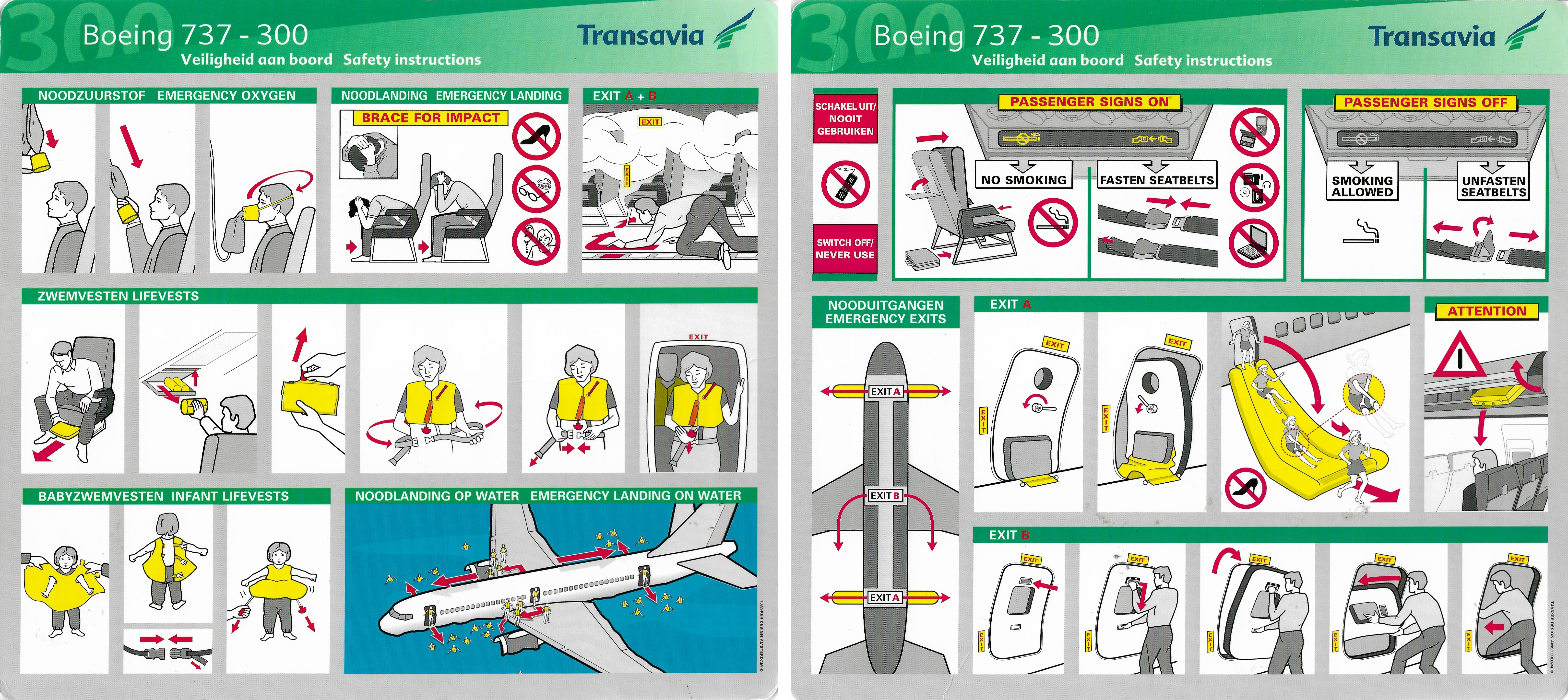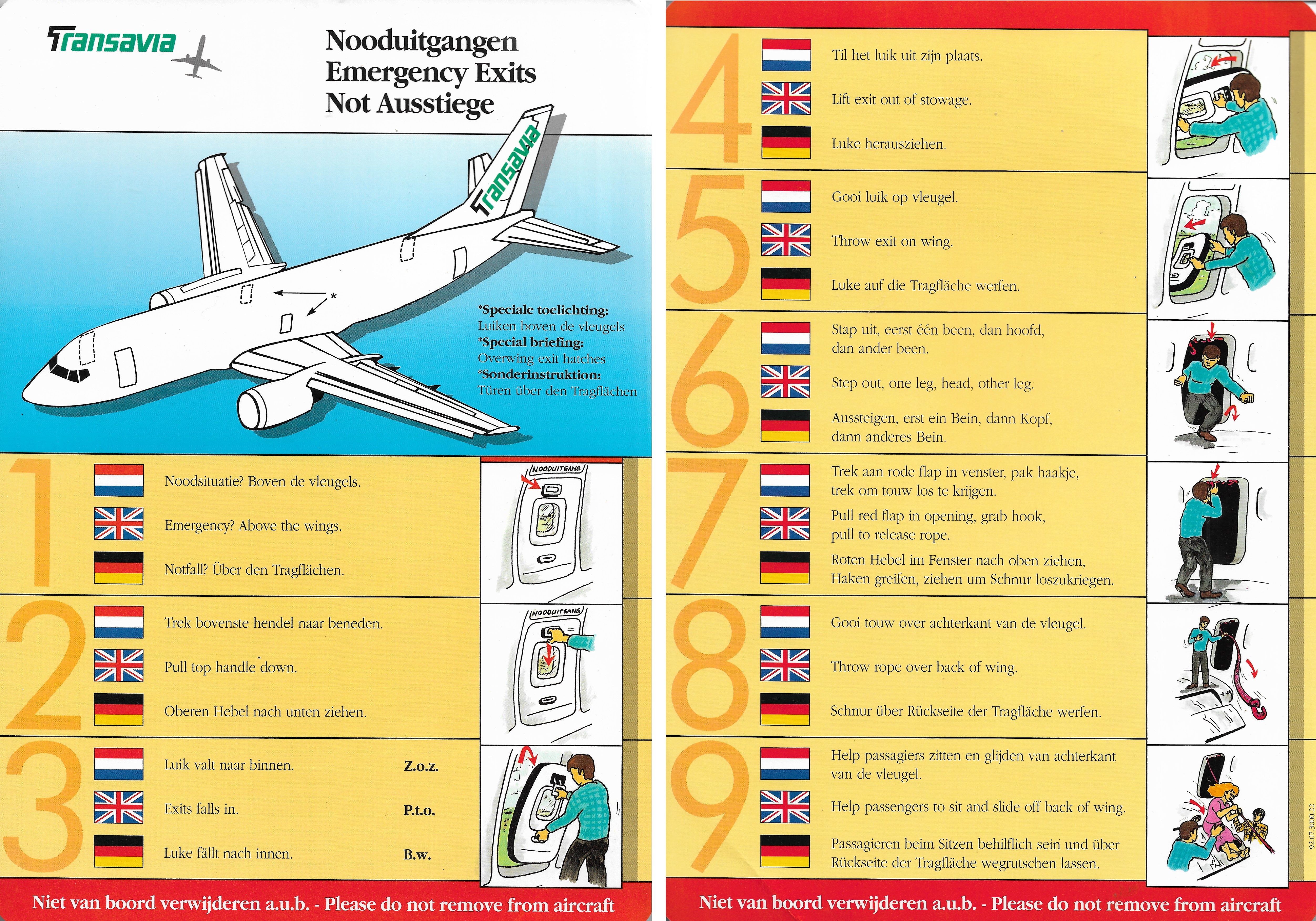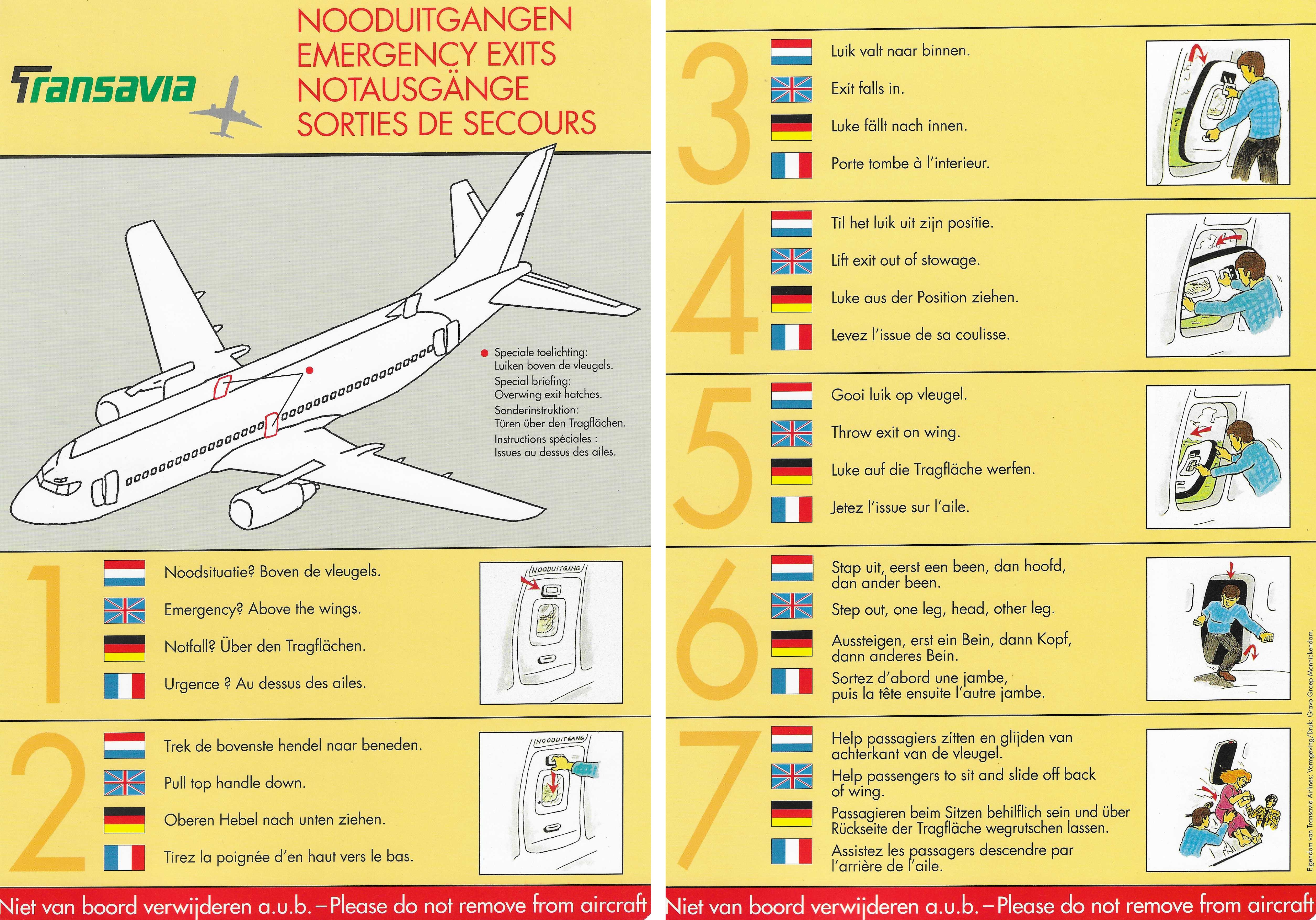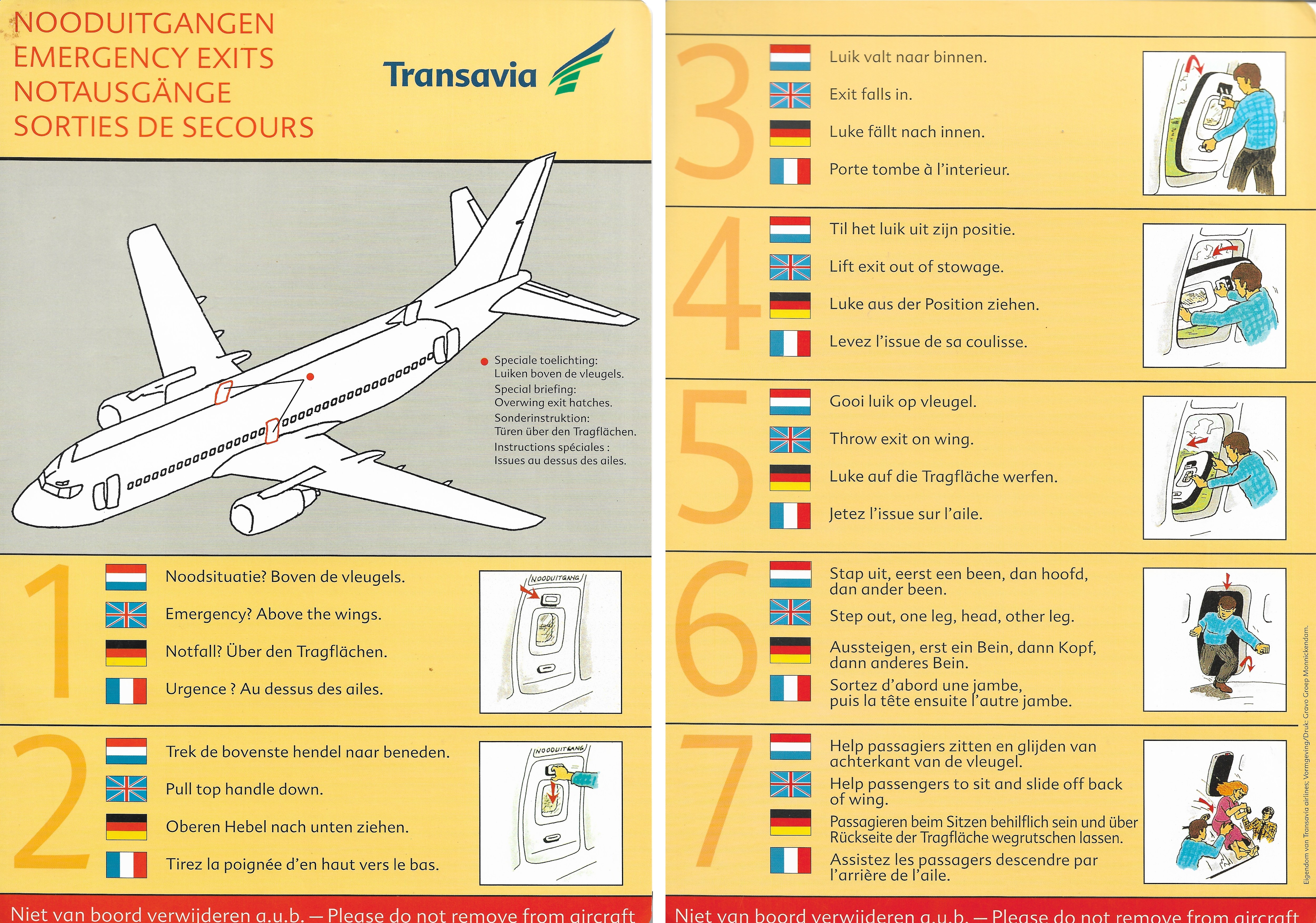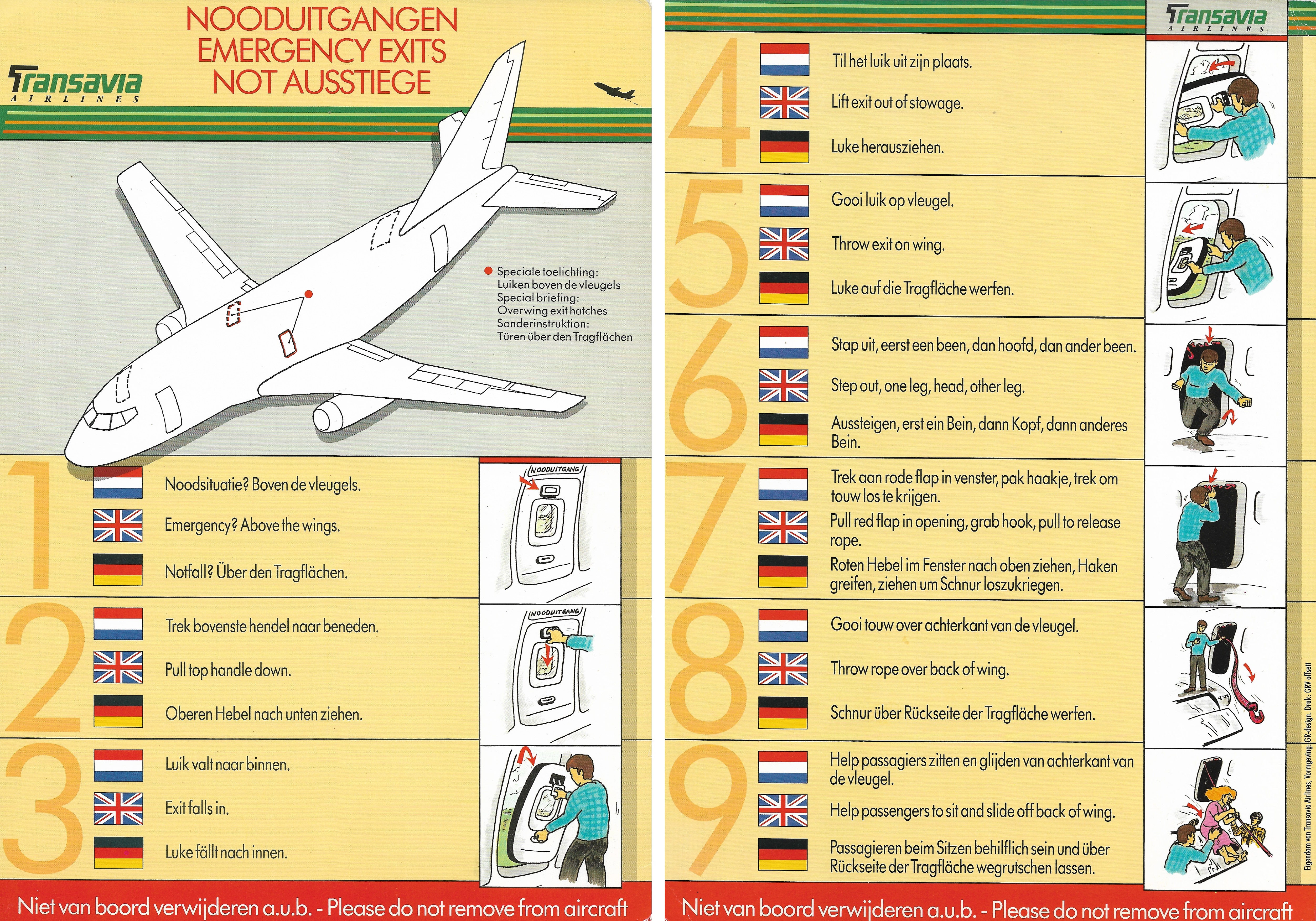 Remarks: NOODUITGANGEN / EMERGENCY EXITS / NOT AUSSTIEGE, Special briefing: Overwing exit hatches