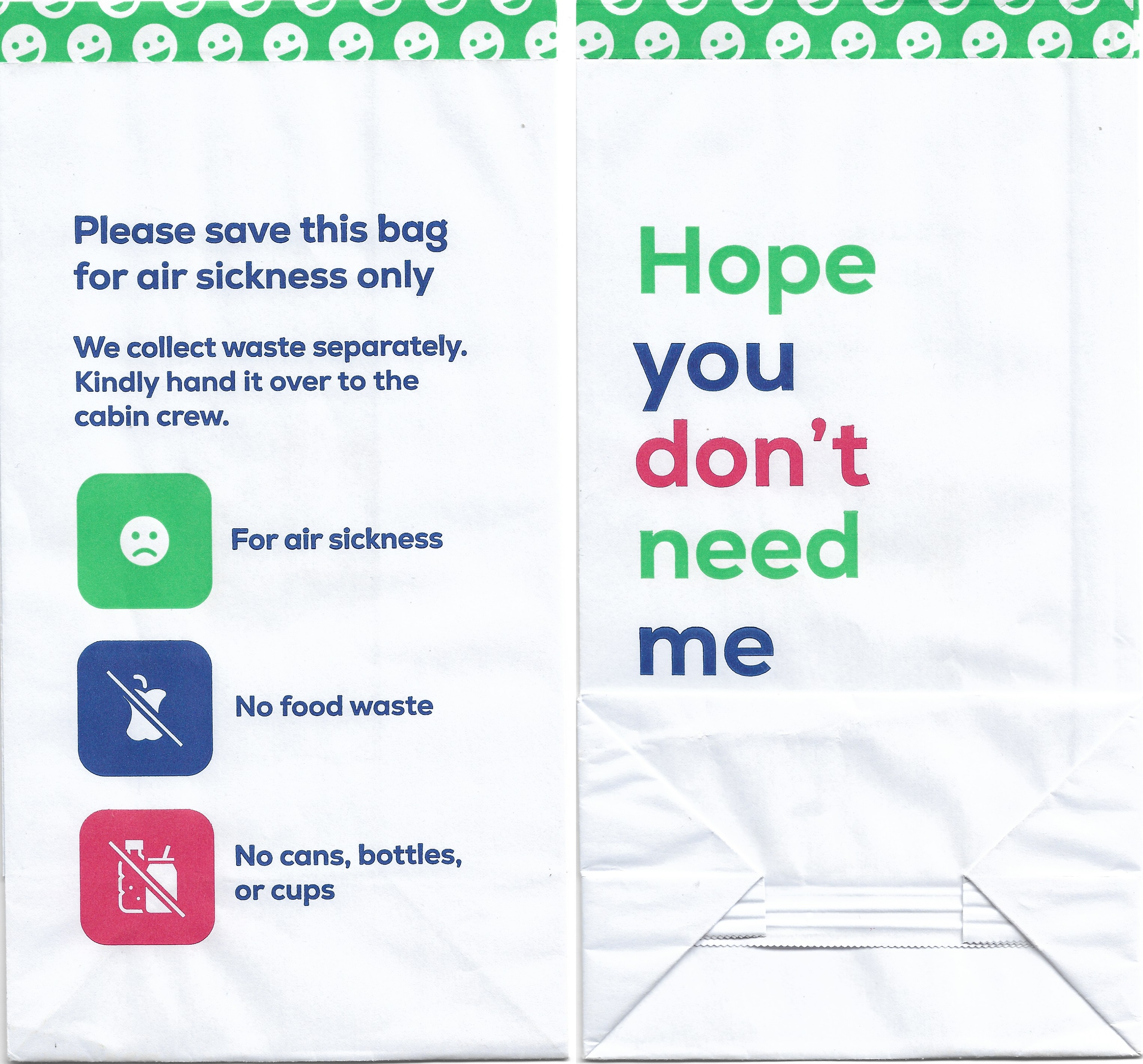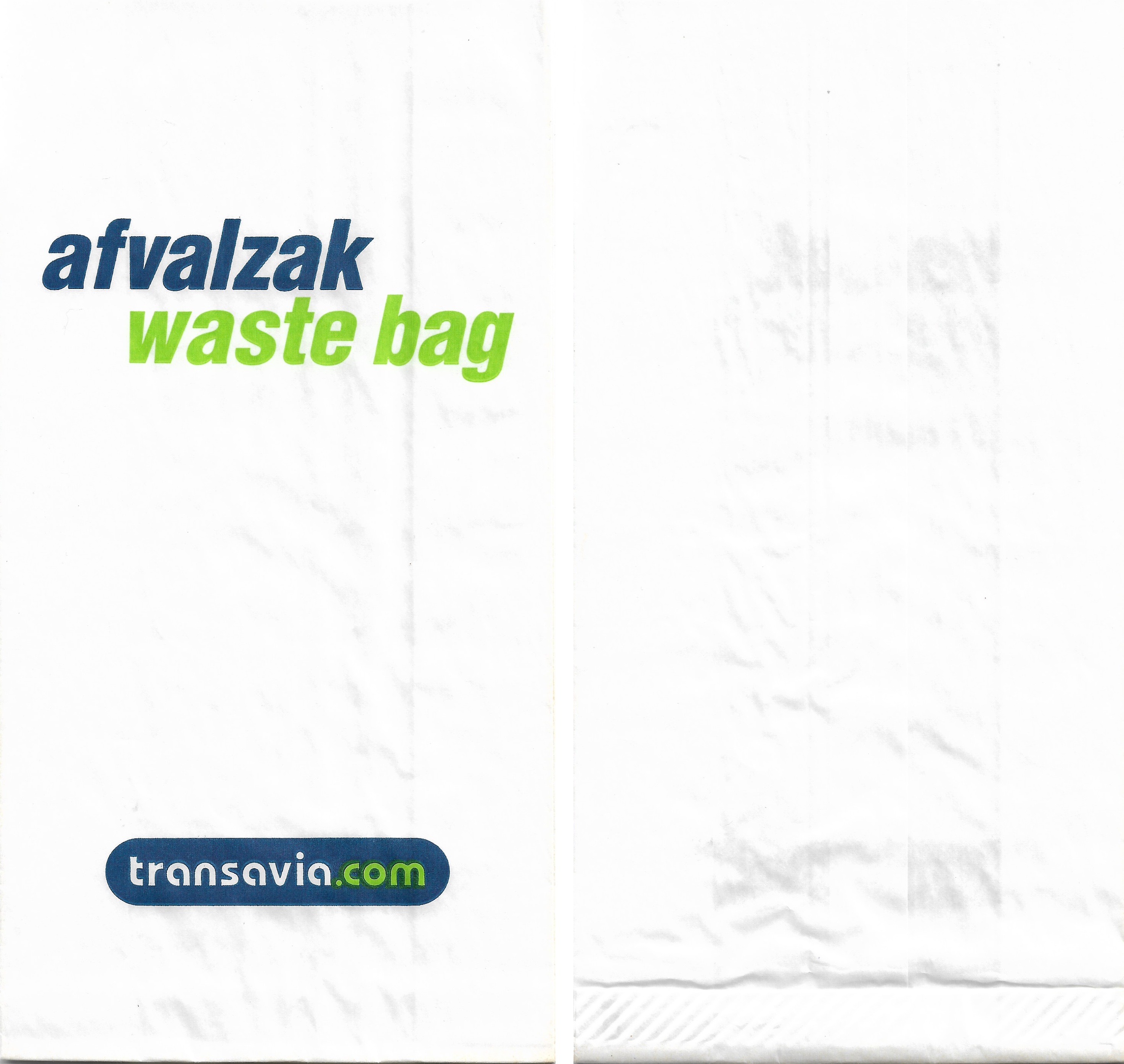 Design: White base with transavia.com logo, blue text: afvalzak and green text: waste bag